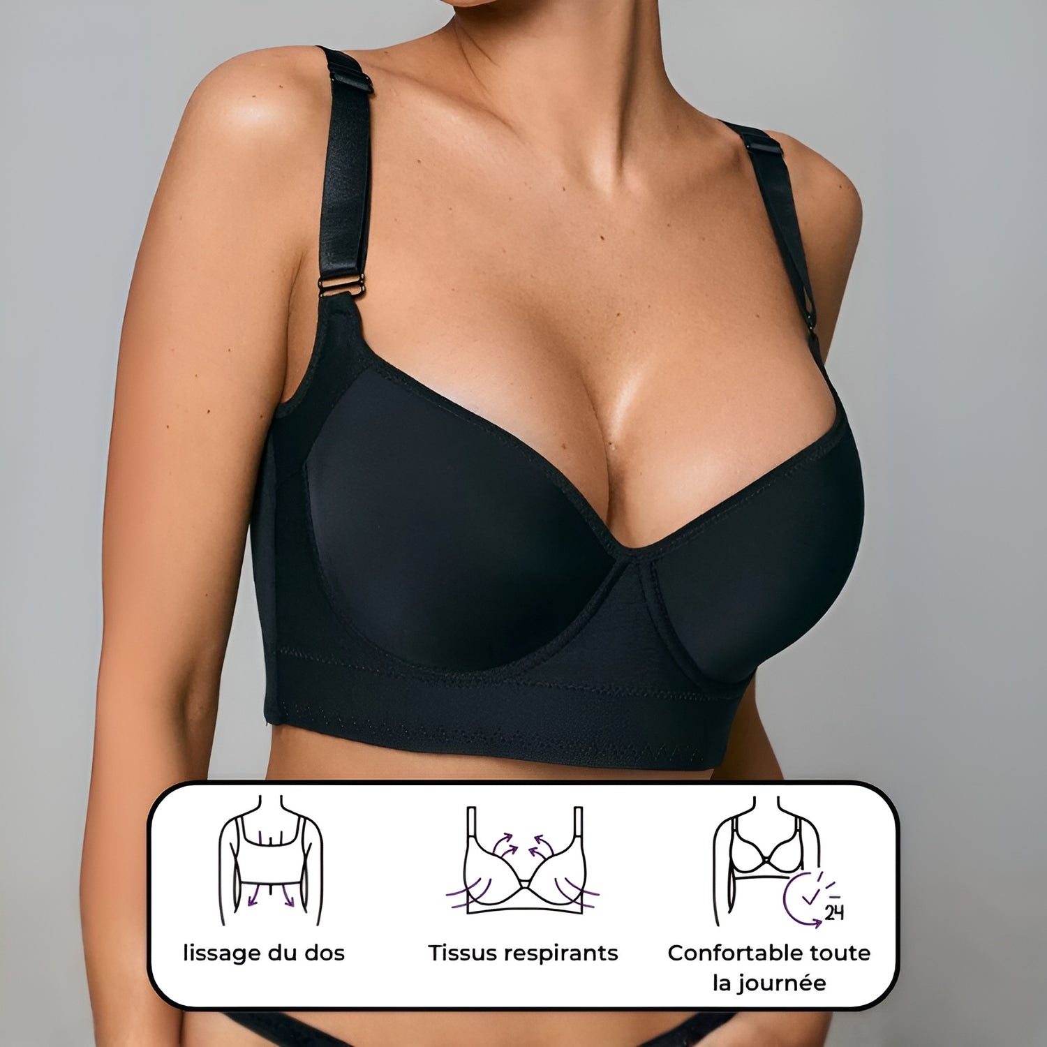 LISSÉA™ est un soutien-gorge galbant et lissant que vous attendiez. Son design innovant lisse votre dos et vous offre un effet liftant défiant la gravité, avec un confort ultime, quelle que soit votre taille. Taille normalement.